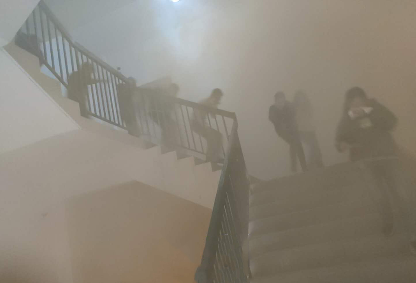 烟雾弥漫,警报响起,大家用湿毛巾捂嘴,按照疏散逃生法则有序逃离火灾模拟现场。