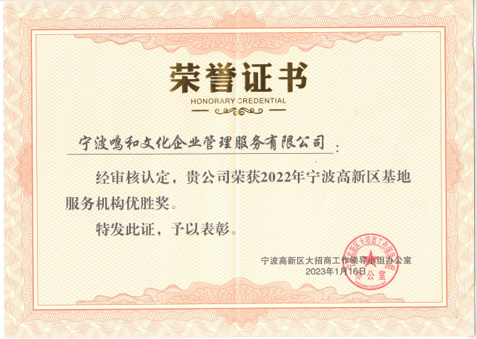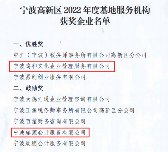 宁波高新区2022年度基地服务机构获奖企业名单公示!宁波民和产业园园区企业:宁波鸣和文化企业管理服务有限公司喜获优胜奖、宁波瑞源会计服务有限公司荣获鼓励奖。