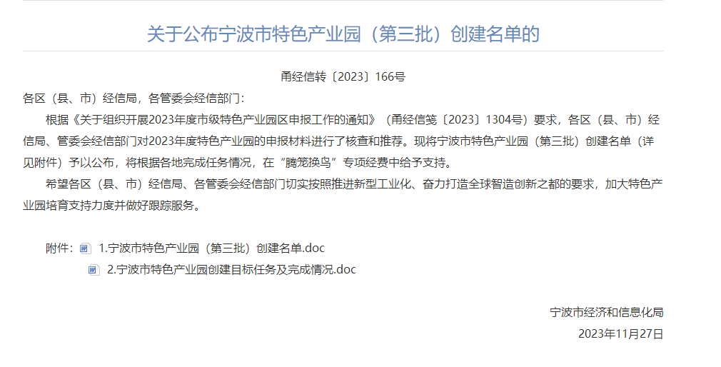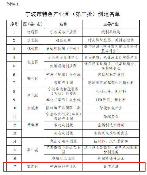 近日,宁波市经济和信息化局公布了《2023年度市级特色产业园创建名单》,宁波民和产业园榜上有名!