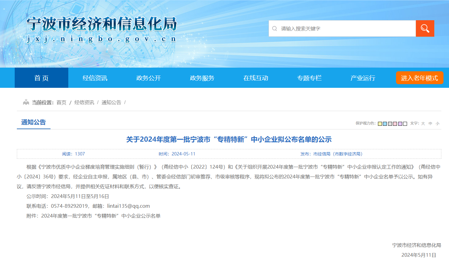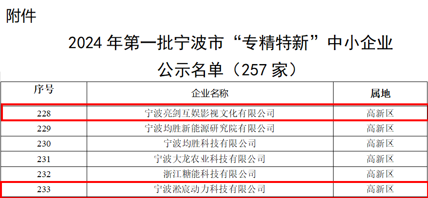 近日,宁波市经济和信息化局公示了2024年度第一批宁波市“专精特新”中小企业名单。其中,园区企业——宁波亮剑互娱影视文化有限公司、宁波淞宸动力科技有限公司榜上有名!