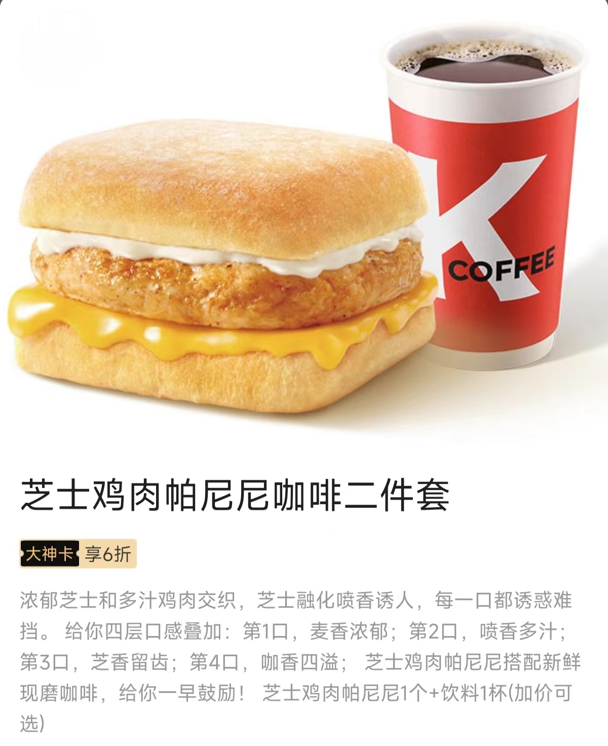 另外,在KFC用大神卡吃早餐,早餐2件套还可享受6折优惠~~