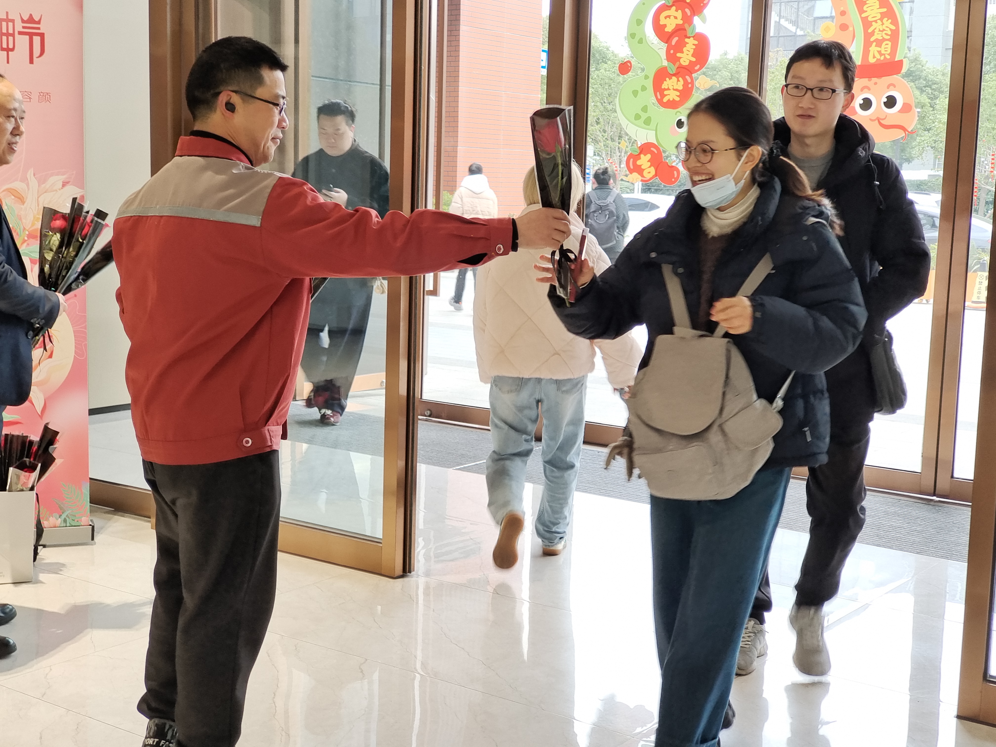 一大早,工作人员充当起“护花使者”的角色,分别早早守候在冬青528、扬帆广场东门、北门门口,手捧一只只含苞待放,娇艳欲滴的红玫瑰,向每一位进门的女神们送上诚挚的祝福。
