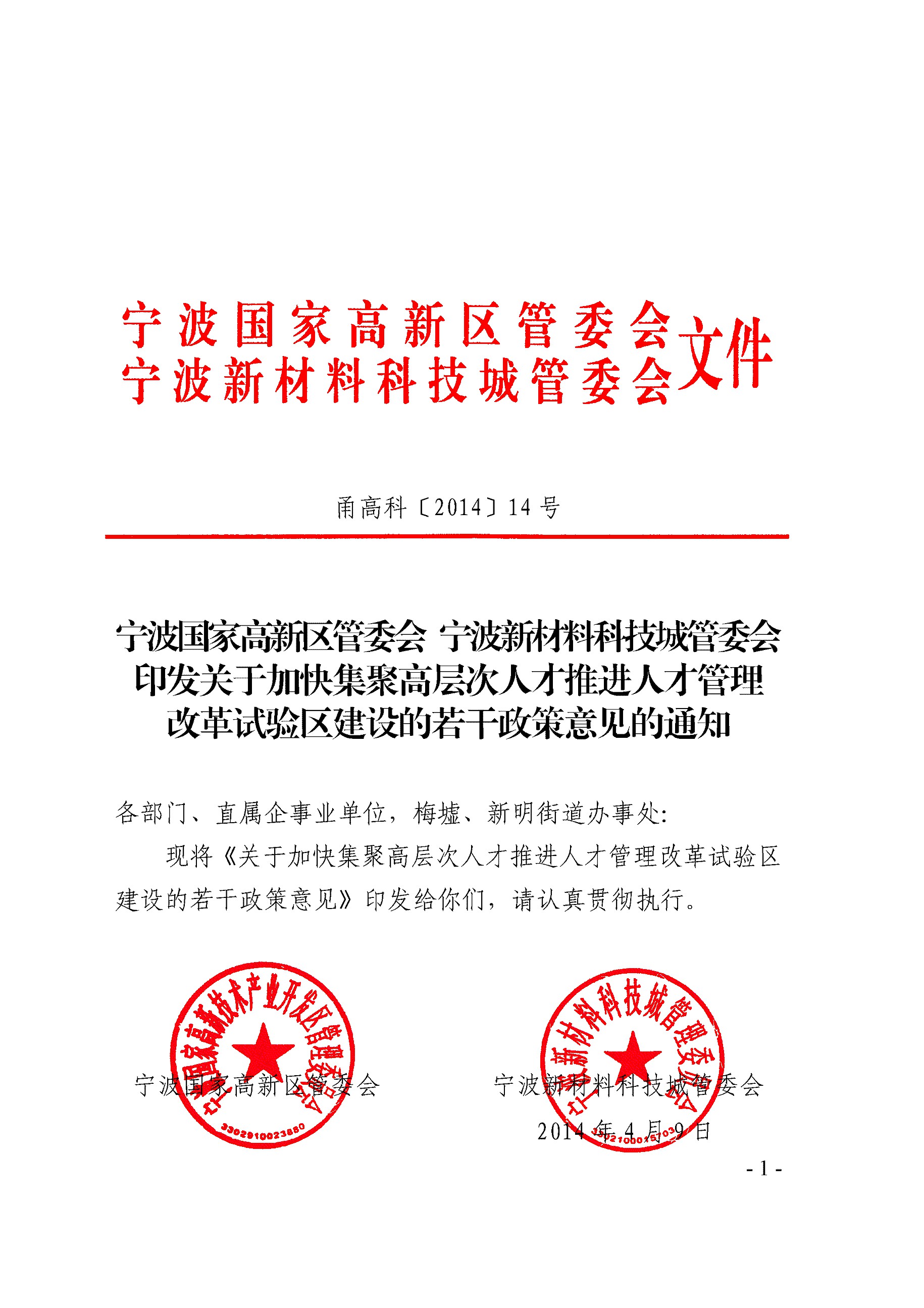 宁波国家高新区管委会办公室 2014年4月9日印发