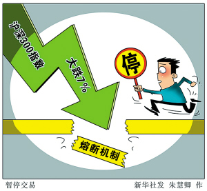 上月4日,沪深证券交易所、中国金融期货交易所发布指数熔断相关规定,选取沪深300指数作为基准指数,在当日下跌5%时暂停交易15分钟,下跌7%时暂停全天交易。熔断机制于今年1月1日起正式实施。