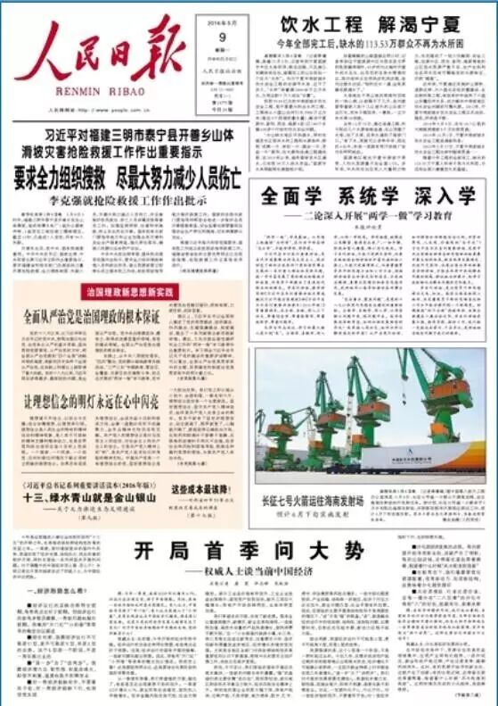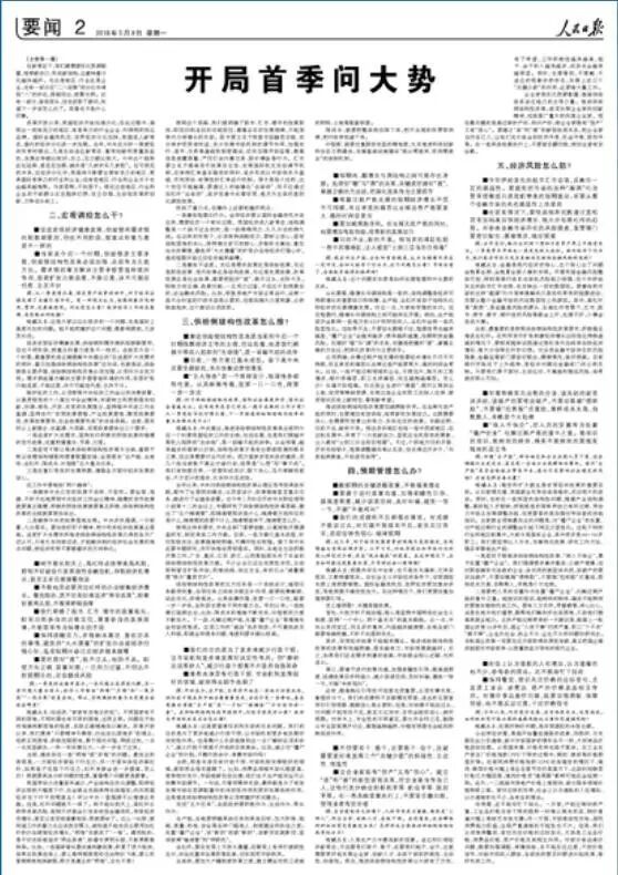 今天(59日)出版的《人民日报》用“头版下半部分通栏,转2版整版”的强势版面,发表了《开局首季问大势——权威人士谈当前中国经济》一文。