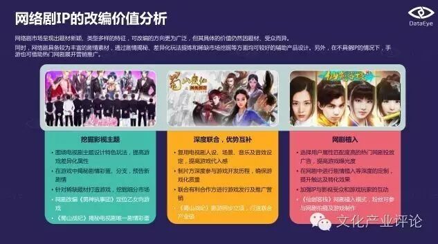 网络剧市场呈现出题材新颖、类型多样的特征,可改编的方向更为广泛,但其具体的价值仍然因题材、受众而异。同时,网络剧具备较为丰富的剧情素材,通过剧情揭秘、差异化玩法提炼和稀缺市场挖掘等方面均可较好的辅助产品设计。另外,在不具备IP的情况下,手游也可借助热门网剧展开营销推广。