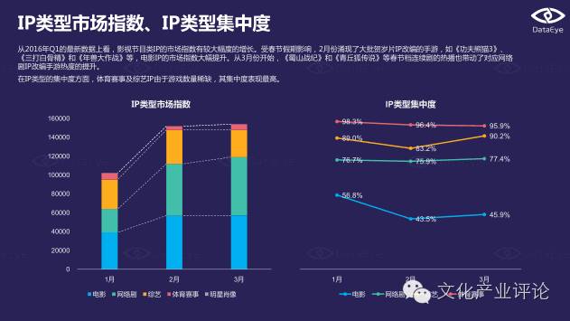 从2016年Q1的最新数据上看,影视节目类IP的市场指数有较大幅度的增长。受春节假期影响,2月份涌现了大批贺岁片IP改编的手游,如《功夫熊猫3》、《三打白骨精》和《年兽大作战》等,电影IP的市场指数大幅提升。从3月份开始,《蜀山战纪》和《青丘狐传说》等春节档连续剧的热播也带动了对应网络剧IP改编手游热度的提升。在IP类型的集中度方面,体育赛事及综艺IP由于游戏数量稀缺,其集中度表现最高。