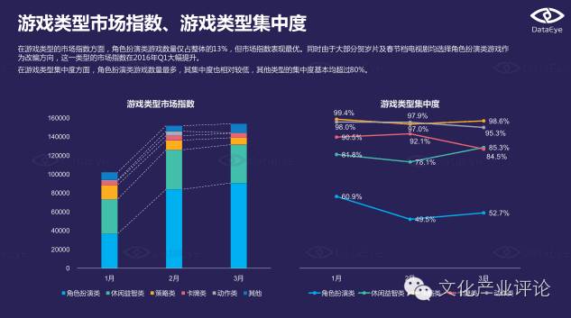 在游戏类型的市场指数方面,角色扮演类游戏数量仅占整体的13%,但市场指数表现最优。同时由于大部分贺岁片及春节档电视剧均选择角色扮演类游戏作为改编方向,这一类型的市场指数在2016年Q1大幅提升。在游戏类型集中度方面,角色扮演类游戏数量最多,其集中度也相对较低,其他类型的集中度基本均超过80%。