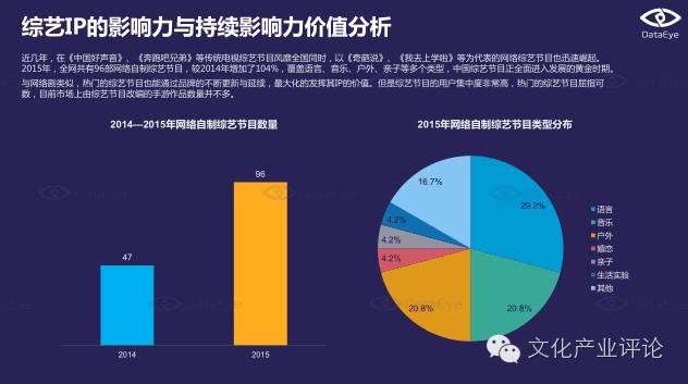 近几年,在《中国好声音》、《奔跑吧兄弟》等传统电视综艺节目风靡全国同时,以《奇葩说》、《我去上学啦》等为代表的网络综艺节目也迅速崛起。2015年,全网共有96部网络自制综艺节目,较2014年增加了104%,覆盖语言、音乐、户外、亲子等多个类型,中国综艺节目正全面进入发展的黄金时期。与网络剧类似,热门的综艺节目也能通过品牌的不断更新与延续,最大化的发挥其IP的价值。但是综艺节目的用户集中度非常高,热门的综艺节目屈指可数,目前市场上由综艺节目改编的手游作品数量并不多。