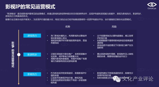 “影游联动”是目前影视IP最常见的运营模式,即通过影视和游戏两种娱乐形态间的跨界合作,实现IP热度和变现能力的提升,表现为影视先行、影游同步、游戏先行三种具体的形式。随着行业泛娱乐化的不断深入,为实现IP价值的最大化,有实力的企业已经开始推进围绕同一优质IP构建全平台、全价值链的泛娱乐化运营模式。
