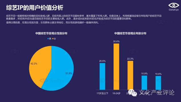 综艺节目一般都有相对明确的目标收视人群,目前市面上的综艺节目题材多样,基本覆盖了所有人群。但是总体上,利用明星效应吸引年轻用户的综艺节目数量最多,80后和90后也是目前综艺节目的主要收视人群。此外,逐步成长起来的00后也开始成为综艺节目的重要目标群体。值得注意的是,在观众性别方面,女性群体占据主导地位,而女性的游戏偏好一般偏休闲向。