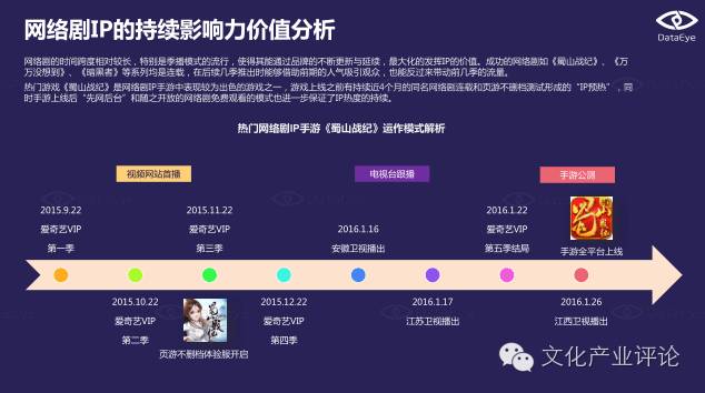 网络剧的时间跨度相对较长,特别是季播模式的流行,使得其能通过品牌的不断更新与延续,最大化的发挥IP的价值。成功的网络剧如《蜀山战纪》、《万万没想到》、《暗黑者》等系列均是连载,在后续几季推出时能够借助前期的人气吸引观众,也能反过来带动前几季的流量。热门游戏《蜀山战纪》是网络剧IP手游中表现较为出色的游戏之一,游戏上线之前有持续近4个月的同名网络剧连载和页游不删档测试形成的“IP预热”,同时手游上线后“先网后台”和随之开放的网络剧免费观看的模式也进一步保证了IP热度的持续。