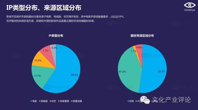 影视节目类IP手游的题材主要来源于电影、电视剧、综艺等IP类型,其中电影IP游戏数量最多,占比达59%。在IP题材的来源区域方面,欧美和中国的影视作品是最主要的手游改编题材来源。