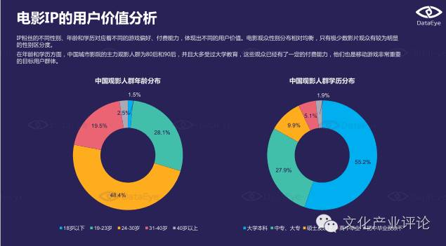 IP粉丝的不同性别、年龄和学历对应着不同的游戏偏好、付费能力,体现出不同的用户价值。电影观众性别分布相对均衡,只有极少数影片观众有较为明显的性别区分度。在年龄和学历方面,中国城市影院的主力观影人群为80后和90后,并且大多受过大学教育,这些观众已经有了一定的付费能力,他们也是移动游戏非常重要的目标用户群体。