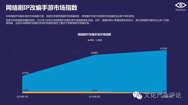 在网络剧IP改编手游的市场指数方面,网游仍然是网络剧IP的改编首选,网络剧IP手游中网游的市场指数也远高于单机游戏。受春节档电视剧热播的影响,2016年2月和3月网络剧IP改编手游市场指数增长迅速。此外,随着网络分季播放模式的流行,部分网络剧可维持长达多个月的高热度,这部分网络剧IP改编的手游在热度持续性上要优于多数电影IP改编手游。