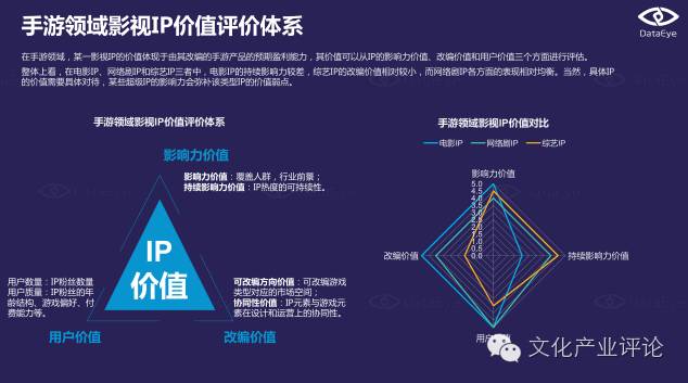 在手游领域,某一影视IP的价值体现于由其改编的手游产品的预期盈利能力,其价值可以从IP的影响力价值、改编价值和用户价值三个方面进行评估。整体上看,在电影IP、网络剧IP和综艺IP三者中,电影IP的持续影响力较差,综艺IP的改编价值相对较小,而网络剧IP各方面的表现相对均衡。当然,具体IP的价值需要具体对待,某些超级IP的影响力会弥补该类型IP的价值弱点。