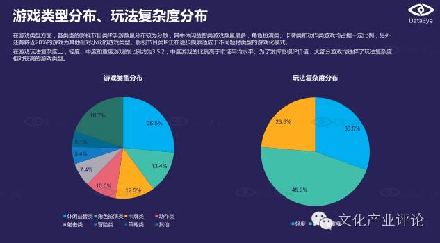 在游戏类型方面,各类型的影视节目类IP手游数量分布较为分散,其中休闲益智类游戏数量最多,角色扮演类、卡牌类和动作类游戏均占据一定比例,另外还有将近20%的游戏为其他相对小众的游戏类型。影视节目类IP正在逐步摸索适应于不同题材类型的游戏化模式。在游戏玩法复杂度上,轻度、中度和重度游戏的比例约为3:5:2,中度游戏的比例高于市场平均水平。为了发挥影视IP价值,大部分游戏均选择了玩法复杂度相对较高的游戏类型。