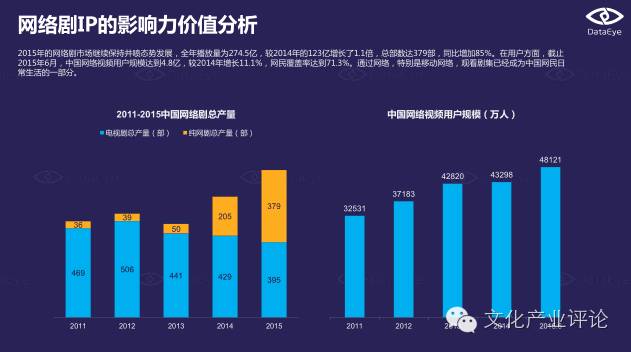 2015年的网络剧市场继续保持井喷态势发展,全年播放量为274.5亿,较2014年的123亿增长了1.1倍,总部数达379部,同比增加85%。在用户方面,截止2015年6月,中国网络视频用户规模达到4.8亿,较2014年增长11.1%,网民覆盖率达到71.3%。通过网络,特别是移动网络,观看剧集已经成为中国网民日常生活的一部分。