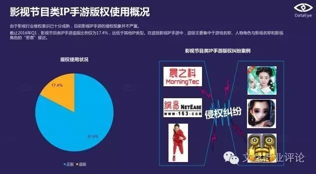 由于影视行业维权意识已十分成熟,目前影视IP手游的侵权现象并不严重。截止2016年Q1,影视节目类IP手游盗版比例仅为17.4%,远低于其他IP类型。在盗版影视IP手游中,盗版主要集中于游戏名称、人物角色与影视名称和影视角色的“恶意”接近。