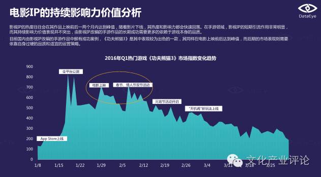 影视IP的热度往往会在其作品上映前后一两个月内达到峰值,随着影片下线,其热度和影响力都会快速回落。在手游领域,影视IP的短期引流作用非常明显,而其持续影响力价值表现并不突出,由影视IP改编的手游作品的长期成功需要更多的依赖于游戏本身的品质。目前国内由影视IP改编的手游作品中鲜有成功案例,《功夫熊猫3》是其中表现较为出色的一款,其同样在电影上映前后达到峰值,而后期的市场表现则需要依靠自身过硬的品质和适宜的运营策略。