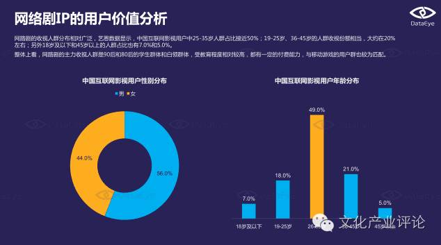 网路剧的收视人群分布相对广泛,艺恩数据显示,中国互联网影视用户中25-35岁人群占比接近50%;19-25岁、36-45岁的人群收视份额相当,大约在20%左右;另外18岁及以下和45岁以上的人群占比也有7.0%和5.0%。整体上看,网路剧的主力收视人群是90后和80后的学生群体和白领群体,受教育程度相对较高,都有一定的付费能力,与移动游戏的用户群也较为匹配。
