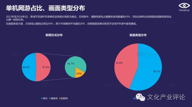 2012年至2016年Q1,影视节目类IP手游单机及网游比例较为接近。在网游中,强联网游戏占据整体游戏数量的43%,而玩法单机化较明显的弱联网游戏也占据一定的比例。在画面类型方面,3D游戏占据的比例达44%,高于市场整体平均值的20%,说明画面效果在影视节目类IP手游中备受重视。