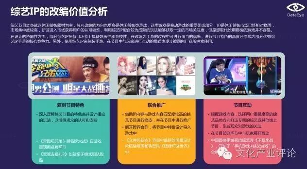 综艺节目本身就以休闲益智题材为主,其可改编的方向也更多是休闲益智类游戏,这类游戏是移动游戏的重要组成部分,但是休闲益智市场已经相对稳固,市场集中度较高,新游进入市场获得用户的认可较难,利用综艺IP配合较为成熟的玩法能够获取一定的市场关注度,但是想取代长期霸榜的游戏并不容易。在设计的协同性方面,部分综艺IP在节目环节上具备娱乐性和竞技性,在改编为手游的过程中可进行适当的借鉴,进行节目特色的高度还原成为部分优秀综艺IP手游的核心竞争力。另外,使用综艺IP来包装手游、在节目中与玩家进行互动的模式也逐步被国内厂商所探索使用。