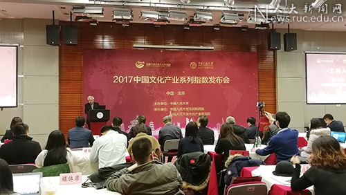 1月19日,“2017中国文化产业系列指数”在中国人民大学发布。中国人民大学副校长贺耀敏出席发布会,中国传媒大学文化发展研究院院长范周、国家行政学院社会和文化教研部主任祁述裕、中央财经大学文化与传媒学院院长魏鹏举、北京大学文化产业研究院副院长向勇、中国人民大学文学院教授金元浦以及其他来自高等院校、研究机构、文化企业、新闻媒体的百余人与会。此次发布会由中国人民大学主办、中国人民大学文化科技园和文化产业研究院承办,新闻学院教授倪宁主持。