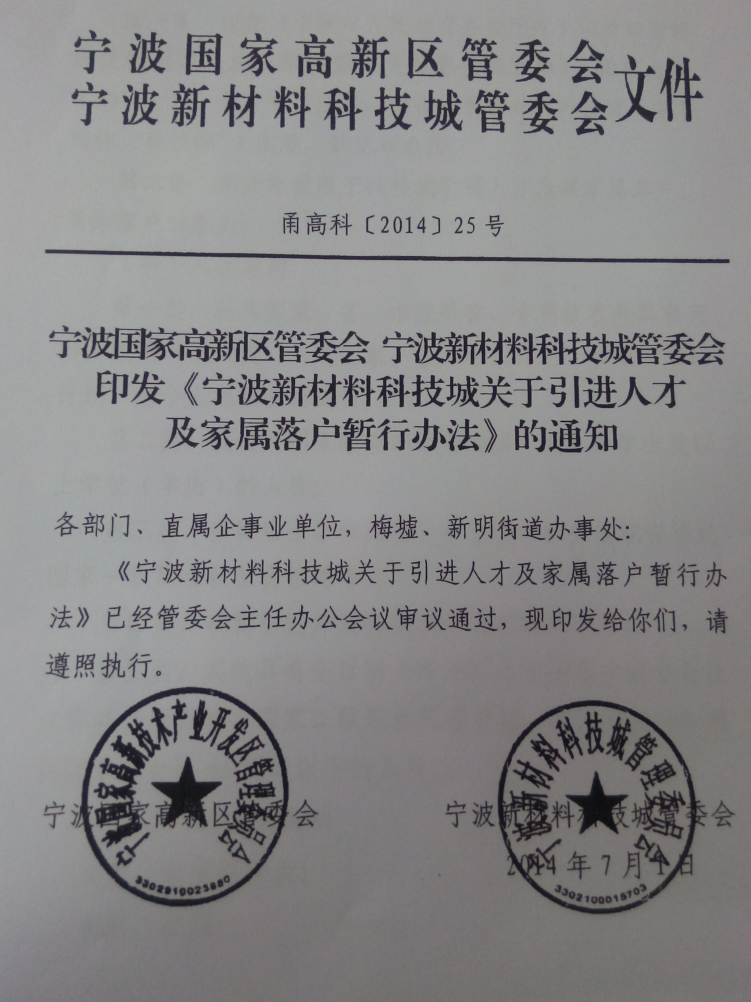 宁波国家高新区管委会 宁波新材料科技城管委会文(甬高科【2014】25号)