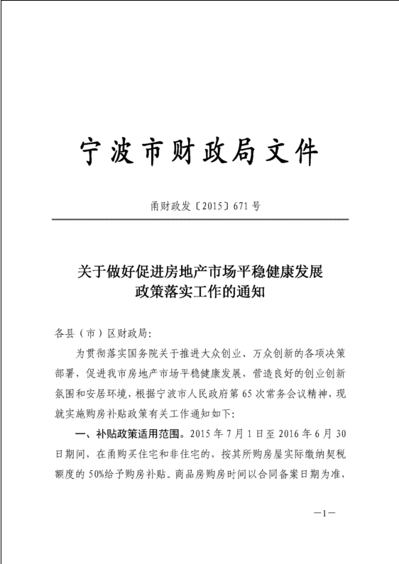 甬财政发(2015)671号关于做好促进房地产市场平稳健康发展政策落实工作的通知