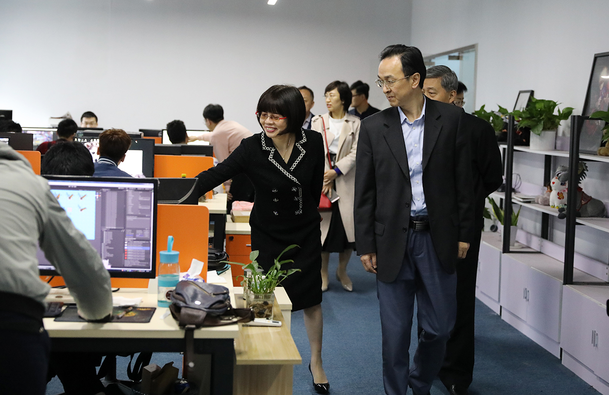 高书生主任和万亚伟部长一行兴致勃勃地参观了扬帆美术馆正在展出的“2019宁波联盟艺术精品展”,及表现中国传统文化的民和龙袍博物馆,并考察了园区企业宁波元素人游戏公司,宁波影视艺术中心及园区文化金融,财务服务中心。